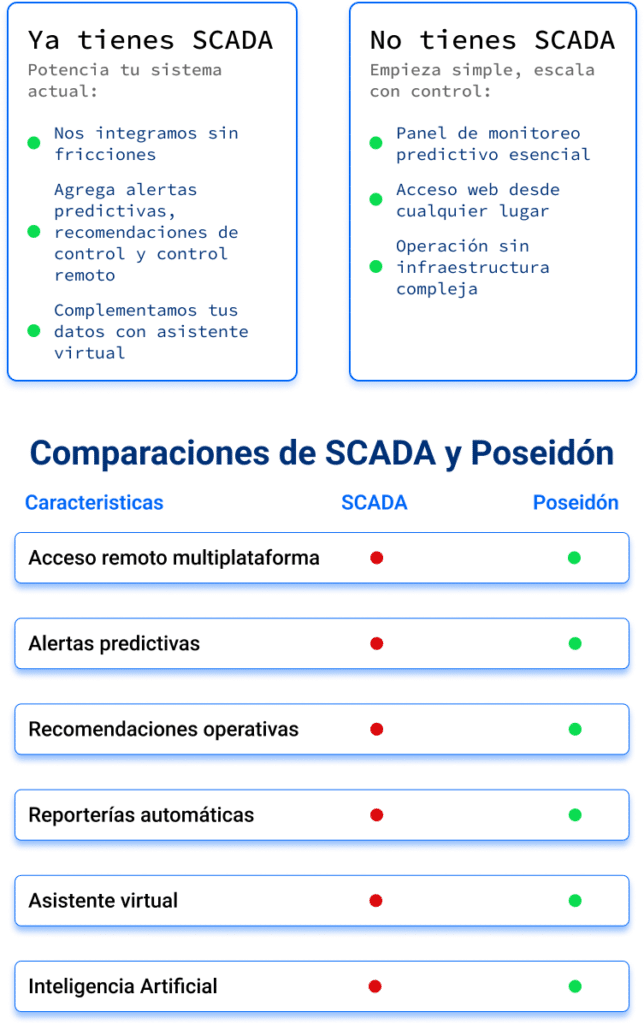 Poseidón monitorea, predice y actúa en tiempo real; se integra con tus sistemas y habilita telecontrol seguro.