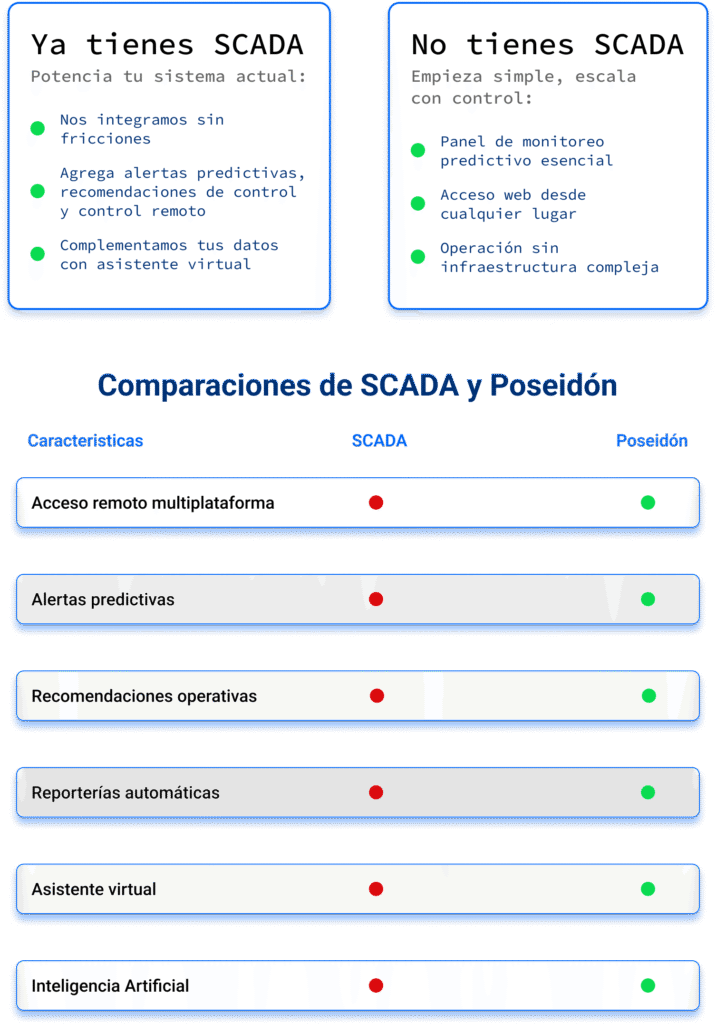 Poseidón monitorea, predice y actúa en tiempo real; se integra con tus sistemas y habilita telecontrol seguro.