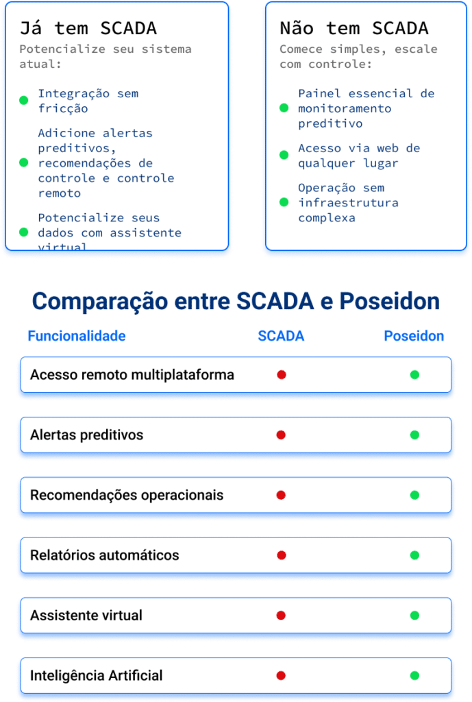Poseidón monitora, prevê e atua em tempo real; integra-se aos seus sistemas e habilita telecontrole seguro.
